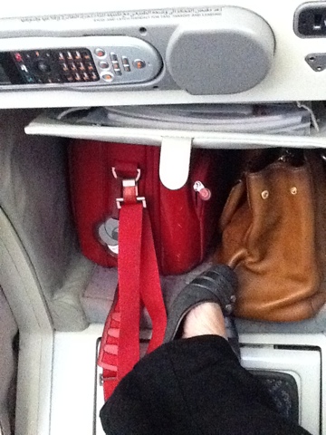 I’m on an Emirates 380. Biggest plane in the sky and gorgeous! I was able to upgrade to Business class for less than $100 USD πŸ™‚ I’m sitting in seat 6D and it’s comfy… Here’s the TV screen and the cubbyhole for my feet… but it’s my bag holder for the moment.