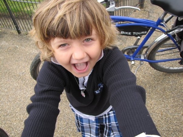 Now to balance out my braggy pictures, I’m posting an equally adorable photo of my granddaughter Sydnie Renae, who rather dislikes having her photo taken, but sometimes she mugs it up for her “Momma”. Here she is on a bike ride through London in 2009: