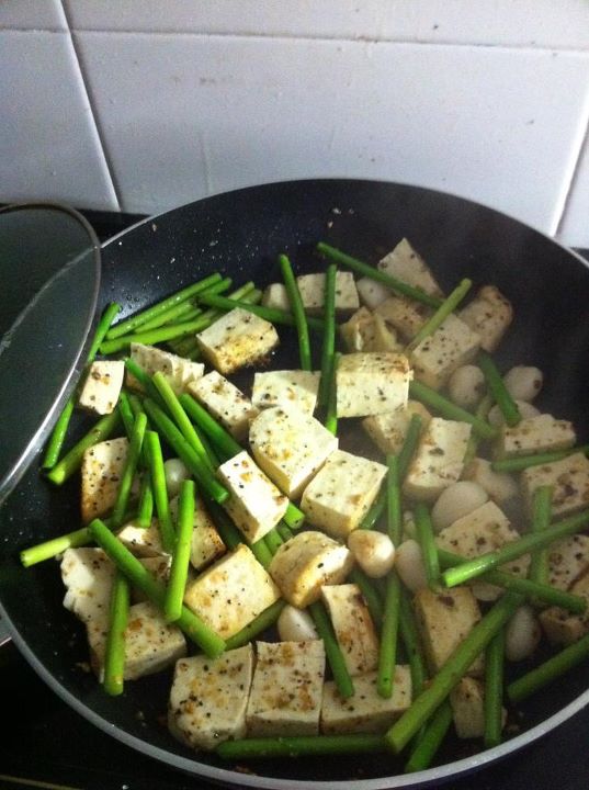 Dinner: Stir-fried tofu with garlic stems and garlic gloves… so yummy! Coke Zero