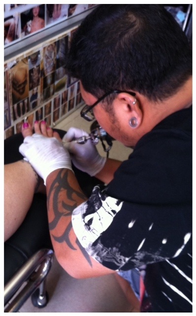 I strangely LOVE the pain from tattoos and this high was over too damn quick! He finished in about 4 short minutes π¦ I was thinking I should have asked for a bigger tat! I even whined to Cathy about it… She thinks I’m a nut π