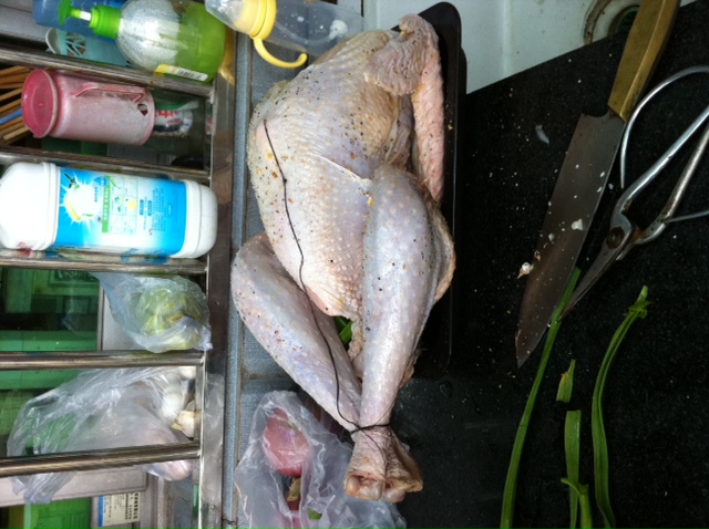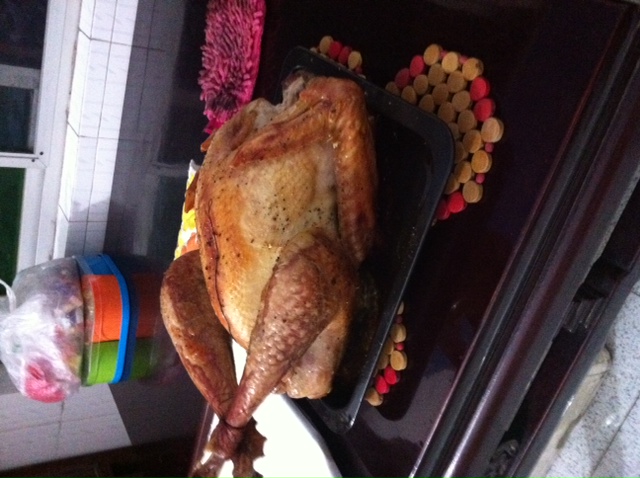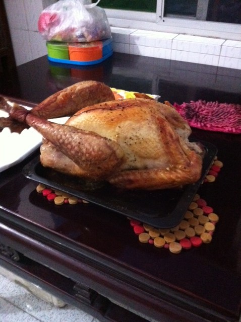 Then Chiara and Joe picked me up around noon and off we went to their house. Let me start by saying they don’t have REAL ovens in China… the Chinese stir fry just about everything and what they don’t stir fry the boil or steam, so no need for ovens!  So I was using a very teeny table top oven (I’ve seen toaster ovens nearly this size!) and my turkey was 13 pounds!!!