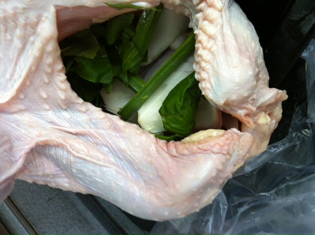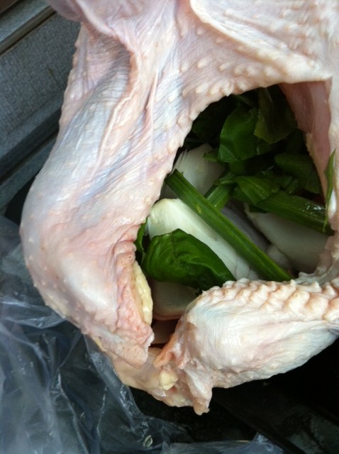 Ugh!!! Anyway, onward I went and I stuffed my bird with my favorite ingredients and some ingredients of the garden there in the back yard…