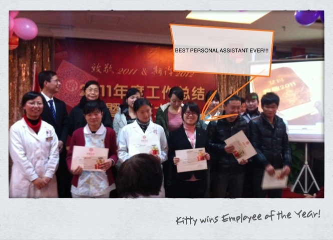 Lunch: 2 tea eggs and a beef steak… Last one, will totally stock up on these when I’m home. I am SO grateful that Cathy brought these to me! 500mL water. Then back to the hospital just in time for our annual award ceremony. My personal assistant, Kitty, won top employee in the International department and she deserves it, what with the sometimes cranky boss she has πŸ˜€