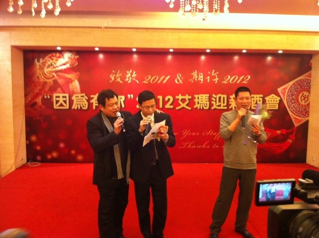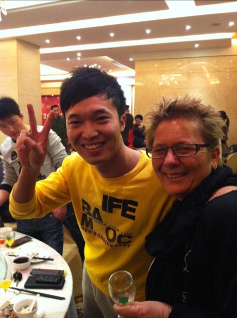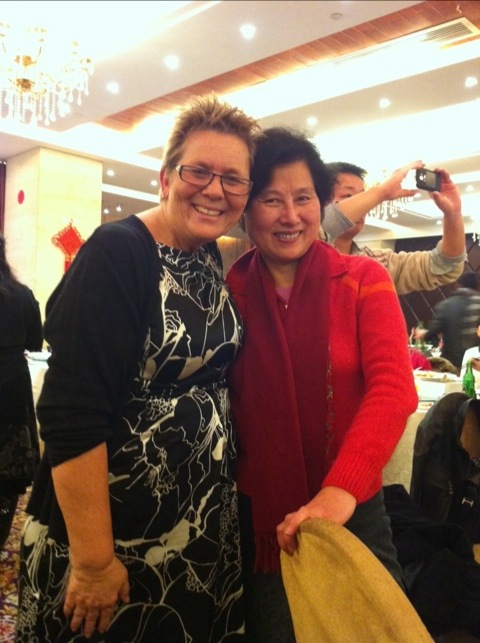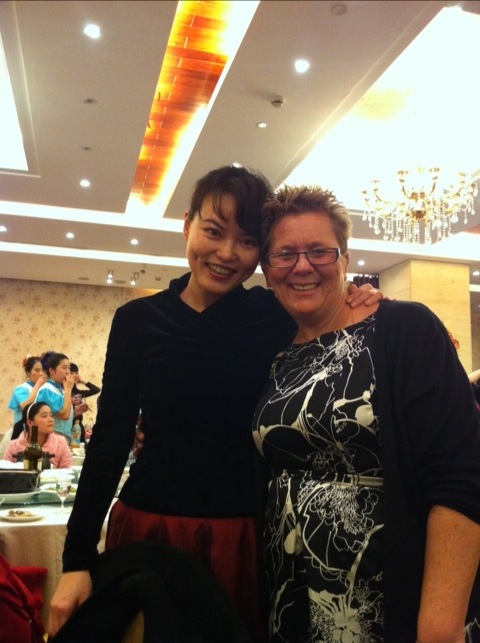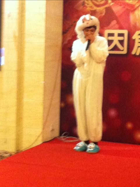 Afterwards I race-walked home because I had 45 minutes to change and hoof it back to the restaurant! Being a midwife, I have amazing powers that have been given to me to change clothes, do hair and put on make-up in record time πŸ™‚ I spent exactly 12 minutes in my flat before racing back out the door, party ready! Then the mile walk back to the restaurant near work… And boy do these people know how to celebrate πŸ˜€ I really had a great time! Pretty much stuck to Dukan with the exception of the 4 ozs of moonshine, errr Chinese “white wine”. It tasted like Sambuca, had quite a kick and everyone else at my table consumed enough to not notice that I didn’t refill my glass. Dinner for me was: broiled fish with liberal chili powder, beef, peel and eat shrimp, steamed veggies, tofu and beef that was in a clearish gravy with tiny bits of hot chili peppers… YUM! I think I avoided gluten, didn’t have that YUCKY belly and I really had a great time. I did not, however, sing Dancing Queen, and now regret that I cancelled 😦 The rest of my quartet were not there… Lucy left Friday, Chiara changed jobs and at the last moment Steve had to cancel because he was assigned to go to Wenzhou for their party. Dancing Queen is not a solo performance. After watching some of the other acts, however, I wish I had just done it. It would have fit right in. There’s always next year. Lots of pictures and then the walk back home, just in time to chat on Skype with some of my favorite people in the world and then a nice, hard sleep. Long, but really fun day!