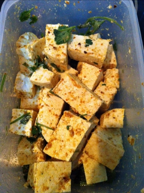 I marinated the tofu in the olive oil, garlic cloves, curry powder, cumin and cinnamon for an hour. Shaking the container gently every 15 mins. or so.