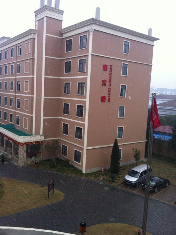 Handover and then bathed 2 babies… got to sing “The Rose” to one of them, as this was on the classic piano CD… the babies love my singing, as off tune as it is. Pretty much caught up on emails and planned out my education presentations for the rest of the month, and had my 2nd tea egg around 10. My darling personal assistant, Kitty, returns on Saturday… can’t wait to see her. Vivien and I had a quiet day in the office, and that was nice. At around 830 Vivien starts yelling for me to come out of my office… it’s snowing. Big, fat snowflakes. Nothing stuck, since it was just above freezing, but everyone in the hospital was happy to see it. I have no idea why… I really despise the cold and the snow… LOL Quite the contrast to the weather in Florida this past week.