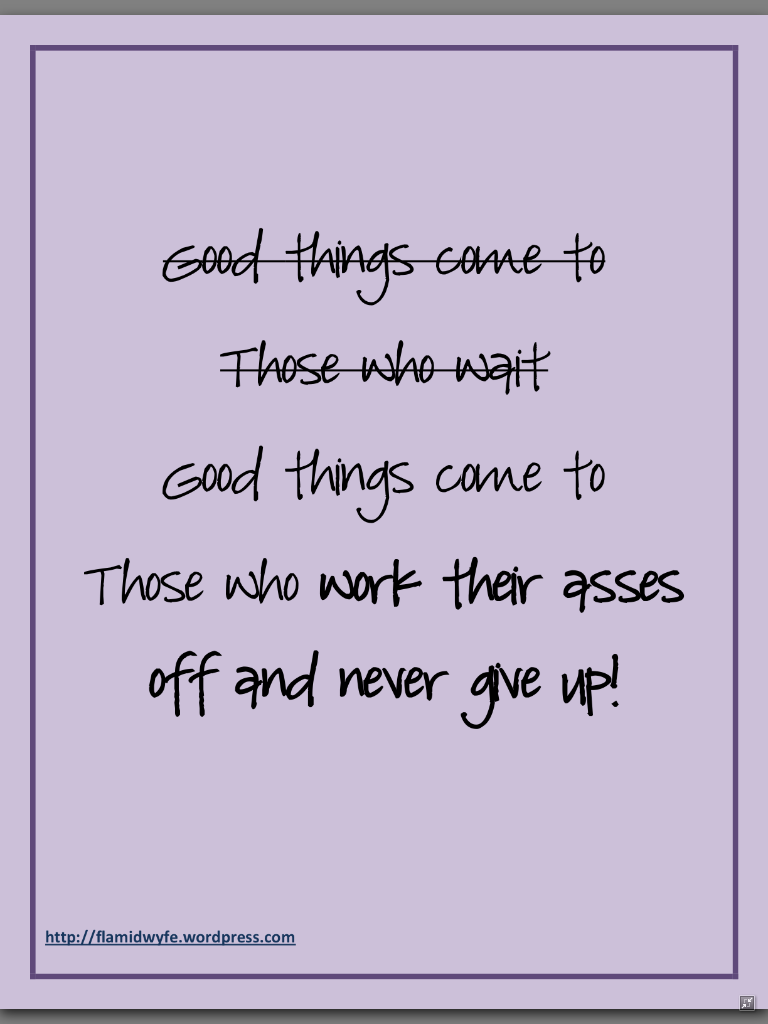 Good things come to… Posted on March 14, 2012 by flamidwyfe Saw this on my friend Kelley’s facebook and thought, this is EXACTLY what my motto has been the last 7 months! Another one for the fridge! Share this: Click to share on Facebook (Opens in new window) Facebook Click to share on X (Opens in new window) X Click to email a link to a friend (Opens in new window) Email Click to share on Pinterest (Opens in new window) Pinterest Like Loading... Related