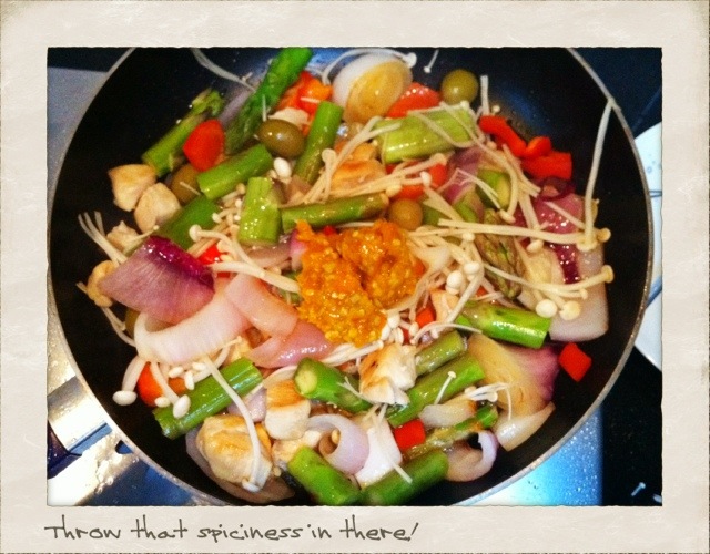 Coat pan/wok with non-stick spray OR 1 Tbs coconut oil. Turn stove on med-high heat.