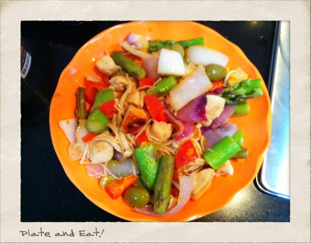 Place asparagus and mushrooms in, stir. Replace lid for 2 minutes.