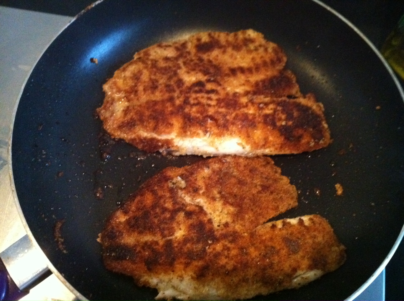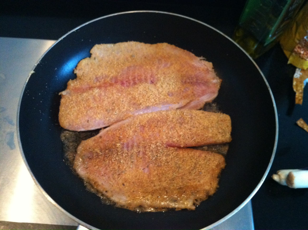 Heat pan to medium. Coat both sides of fillets until well covered and place in hot pan.