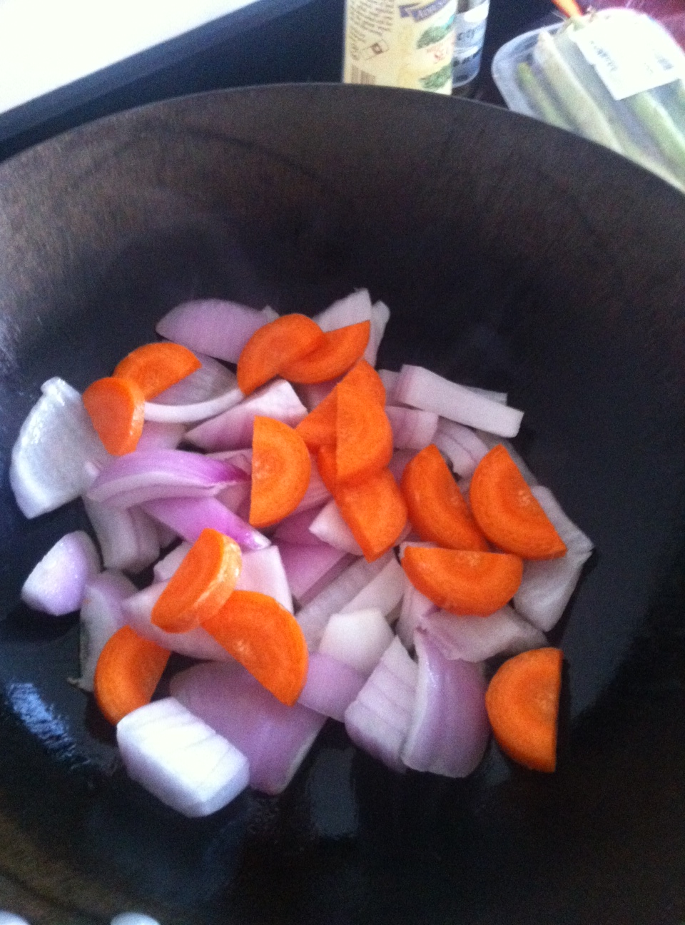 I chopped 2 onions and a nice piece of ginger and tossed into the crockpot, put in just enough water to cover the bottom, placed the Roo on top of that and poured the drippings from the pan on top of all of it…