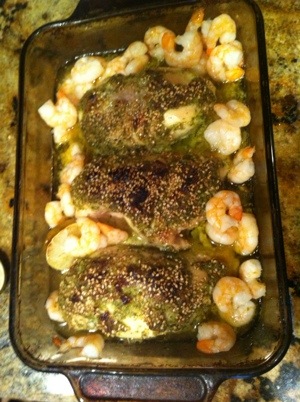 After an additional 15 minutes, pull out the asparagus, add the shrimp to the chicken dish, drizzle a teeny bit of olive oil on shrimp and put oven on BROIL for 8 more minutes.