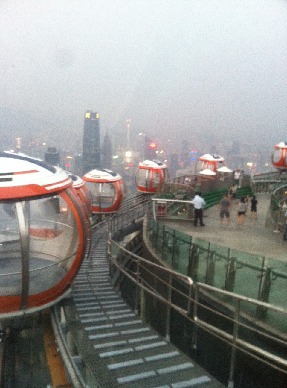 Then we went to the roof of the building to ride the “ferris wheel”. Which actually runs around the rim of the building on this little itty bitty track… yes, I was seeing how much adrenaline I actually could pump through my body in one evening 😀 It is an amazing 15 minute slow crawl around the entire building, with unobstructed views in a bubble. Again, at first we clung to the rails and each other, then loosened up when we realized we weren’t going to plunge to our deaths 🙂