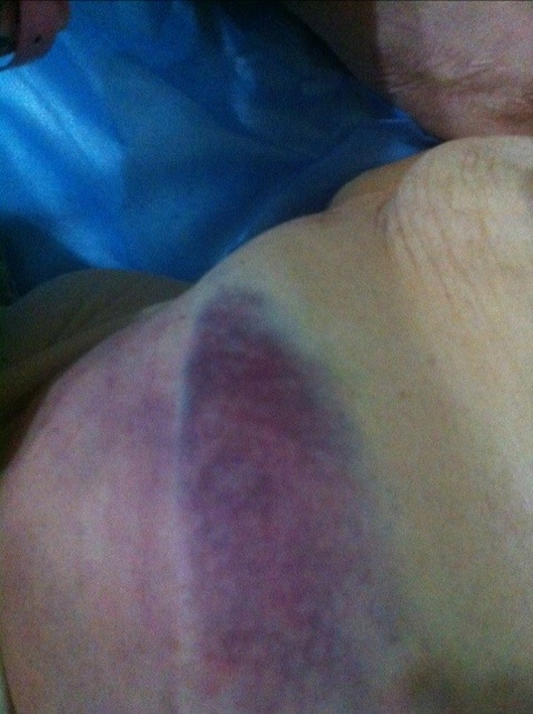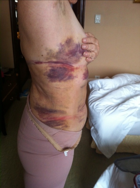 Kitty lovingly went back to the hotel to bring me yogurt for breakfast. And the news that the Taizhou CEO really, really wanted me to go there for their Sunday water birth event. He’s a really nice guy, I laid out the terms of what would need to be done to make it happen and within in an hour it was settled… Kitty and I were leaving Wenzhou to go back for one night in Hangzhou. So off we went… Less than 24 hours post op… Before we left Kitty took these lovely pics of my bruising…