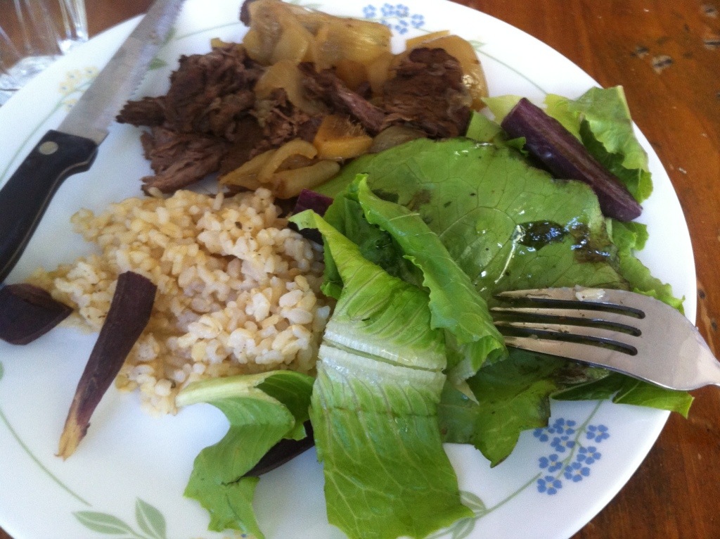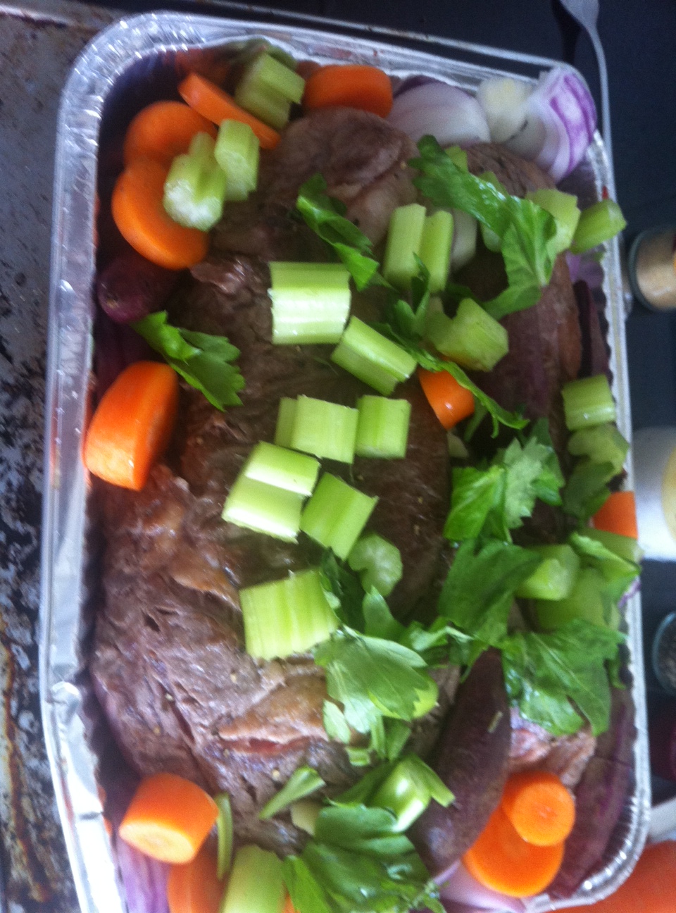 I cooked the roast for 3.5 hours in the toaster oven and it was PERFECT… I had to fight the urge to not consume it before the guests arrived! The meat fell apart with the fork. In the container with the roast I added the onions, taro and carrots.